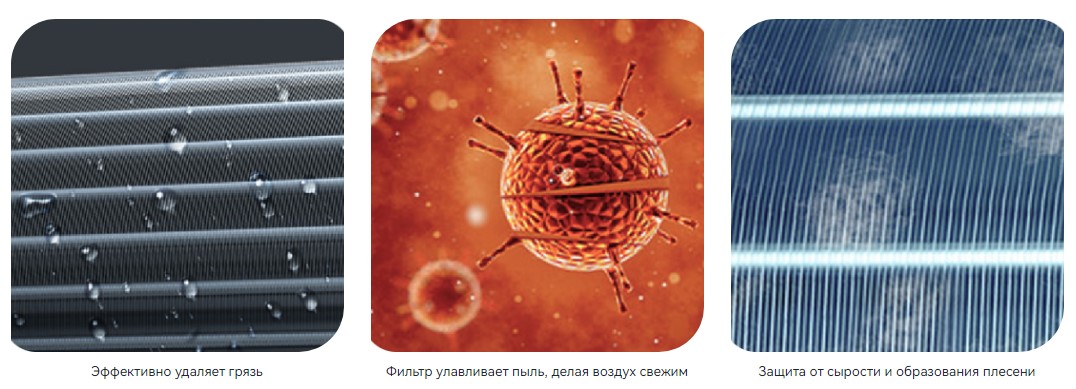 На испарителе используется гидрофильное покрытие. Когда вы нажимаете на кнопку самоочистки на пульте, поверхность испарителя быстро охлаждается и покрывается инеем — расширяясь и замерзая, влага выталкивает с поверхности трубки всю накипь и грязь. Затем кондиционер также быстро нагревается, иней смывается, а испаритель остается чистым и абсолютно сухим — без неприятных запахов и бактерий.